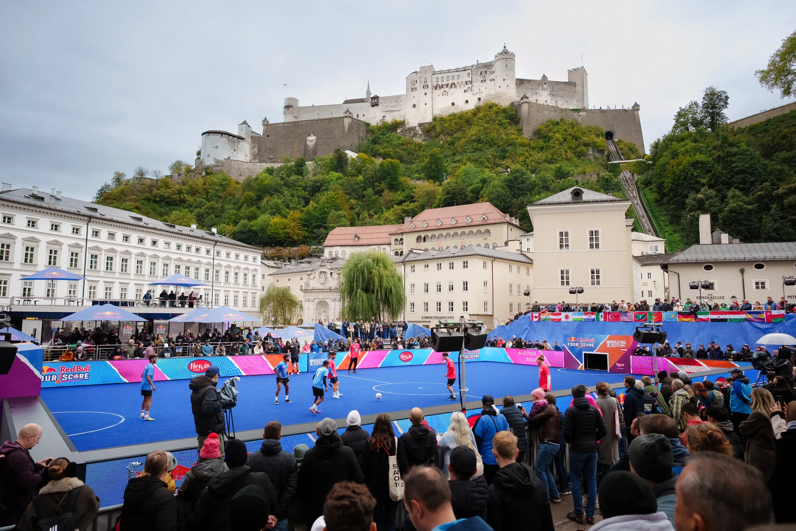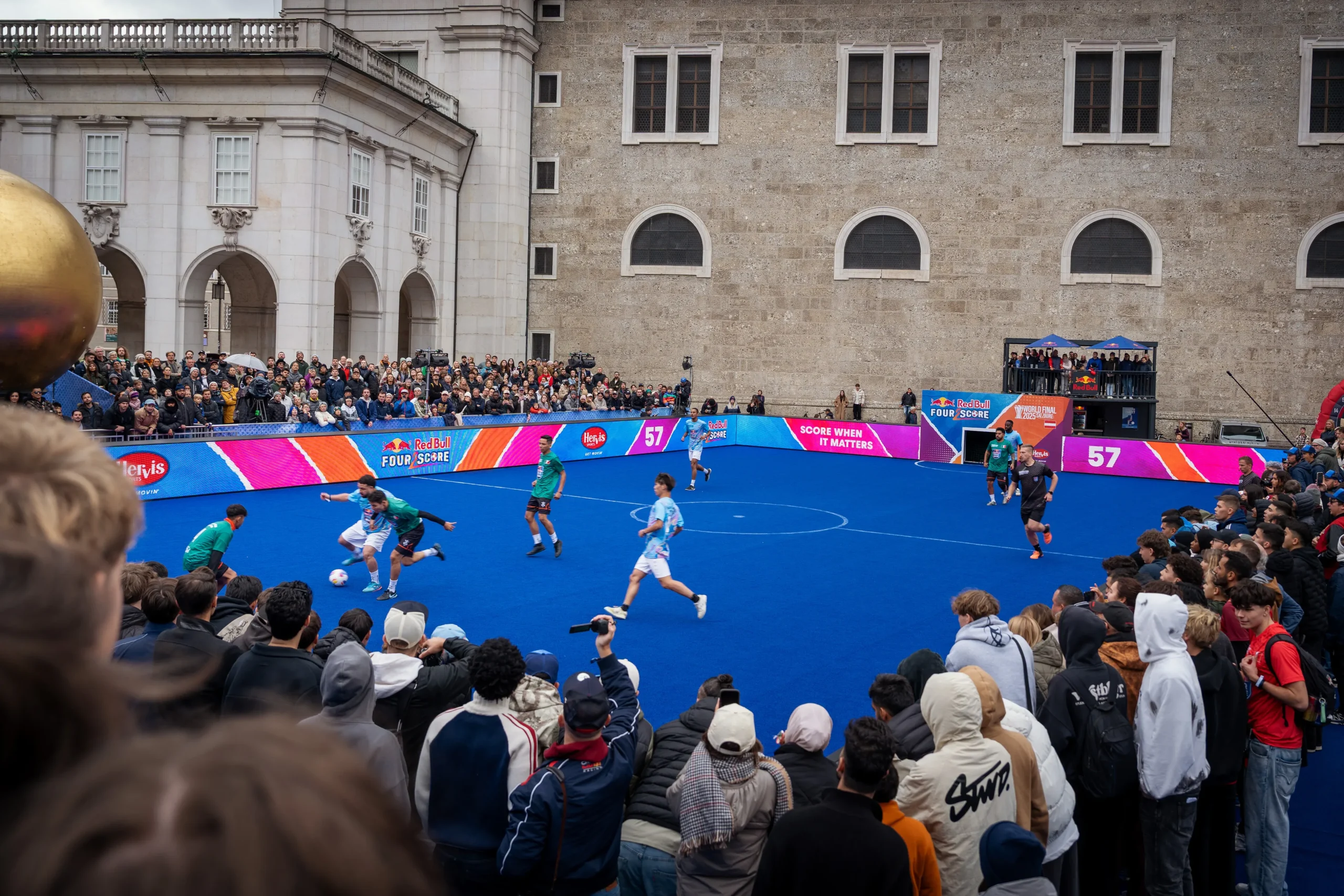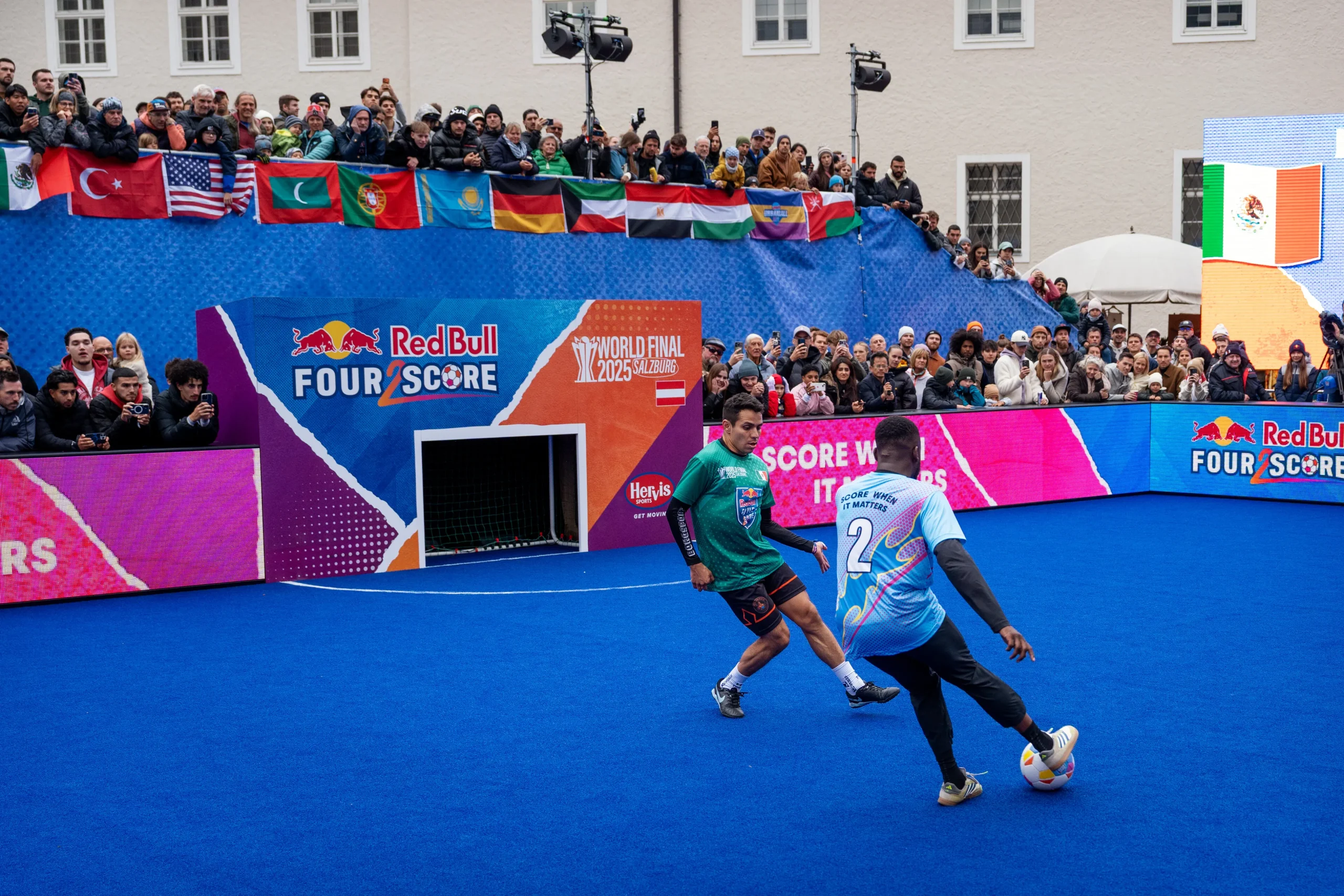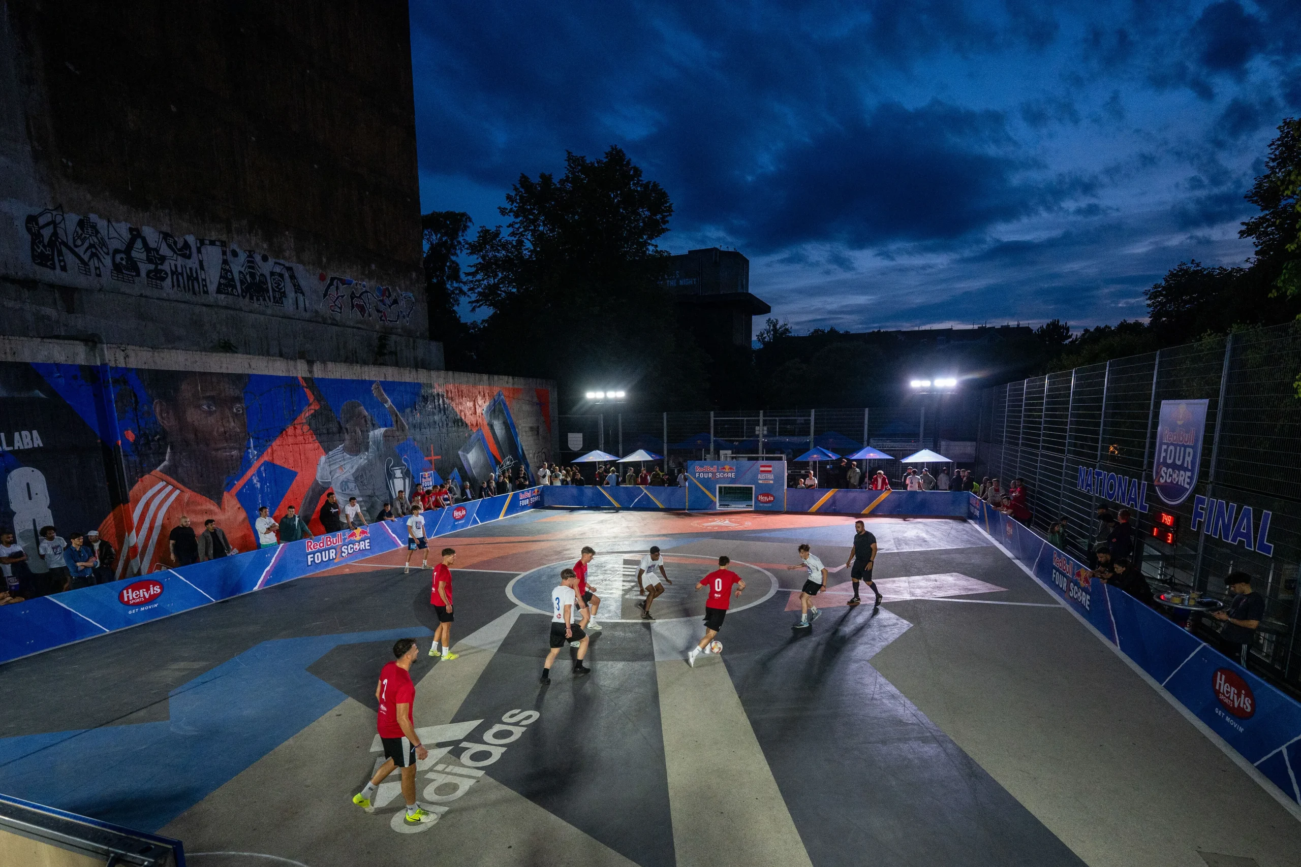 Red Bull Four 2 Score ist ein internationales Kleinfeld-Fußballformat, das für Tempo, Intensität und urbane Energie steht. Weltweit treten Teams in nationalen Qualifikationen an, um sich für das World Final zu qualifizieren. Im Rahmen dieses Formats durften wir zwei zentrale Eventhighlights umsetzen: das National Final in Wien sowie das World Final in Salzburg.